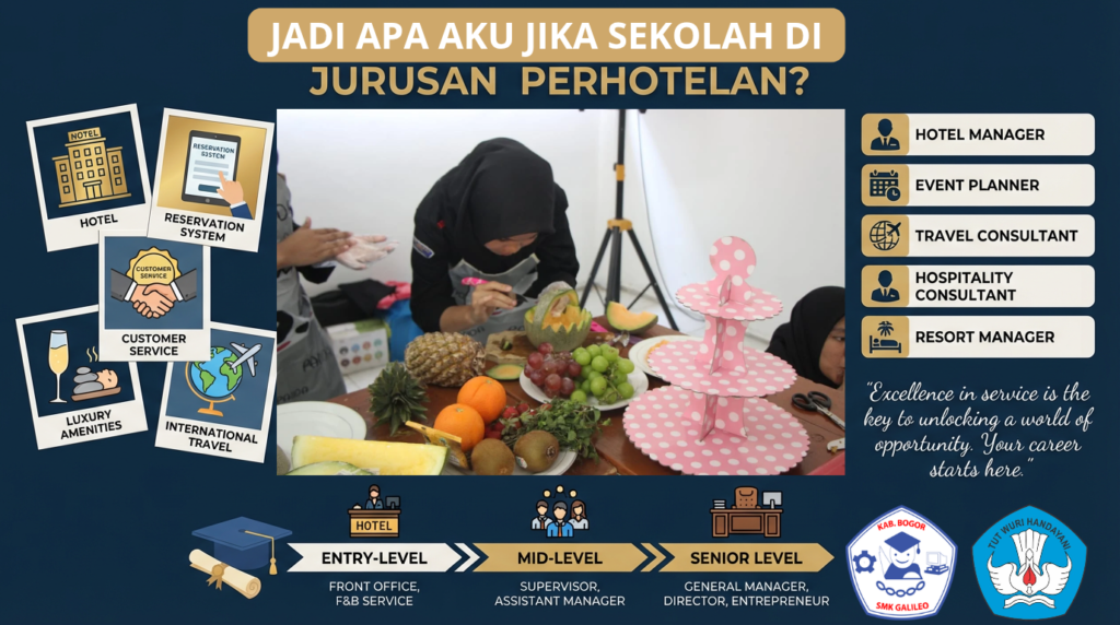 Industri perhotelan merupakan salah satu pilar utama perekonomian global, termasuk Indonesia, yang terus berkembang seiring dengan pertumbuhan sektor pariwisata. Bagi mereka yang memilih jurusan perhotelan, baik di SMK maupun jenjang pendidikan tinggi, peluang karir yang terbuka sangat luas dan beragam. Infografis dari SMK GALILEO yang bertajuk “Apa Jadi Aku Jika Sekolah di Jurusan Perhotelan?” secara jelas menggambarkan apa saja yang akan dipelajari dan karir apa yang bisa ditekuni setelah menyelesaikan pendidikan di bidang ini.