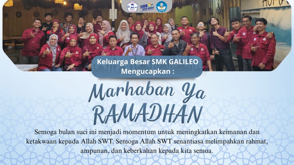 Marhaban Ya Ramadhan dari Keluarga Besar SMK Galileo, Bulan suci Ramadhan telah tiba, dan seluruh keluarga besar SMK Galileo menyampaikan ucapan hangat “Marhaban Ya Ramadhan” kepada semua umat Muslim. Dalam foto yang diabadikan, guru dan staf sekolah berkumpul dengan wajah ceria, sebagian besar mengenakan seragam merah. Mereka menunjukkan semangat kebersamaan dan kegembiraan menyambut kedatangan bulan penuh berkah ini, dengan beberapa di antaranya memberikan tanda tangan hati atau jempol sebagai bentuk dukungan dan harapan baik. Dalam pesan yang disampaikan, SMK Galileo mengajak agar bulan suci ini menjadi momentum penting untuk meningkatkan keimanan dan ketakwaan kepada Allah SWT. Semoga setiap amalan yang dilakukan selama Ramadhan dapat membawa berkah, serta Allah SWT senantiasa melimpahkan rahmat, ampunan, dan keberkahan kepada seluruh masyarakat, khususnya bagi keluarga besar sekolah dan seluruh umat Islam di seluruh penjuru negeri. Kebersamaan yang terlihat dalam foto tersebut juga mencerminkan semangat gotong royong yang menjadi bagian dari budaya sekolah, di mana setiap individu saling mendukung untuk menjalankan ibadah dan memperbaiki diri selama bulan Ramadhan.
